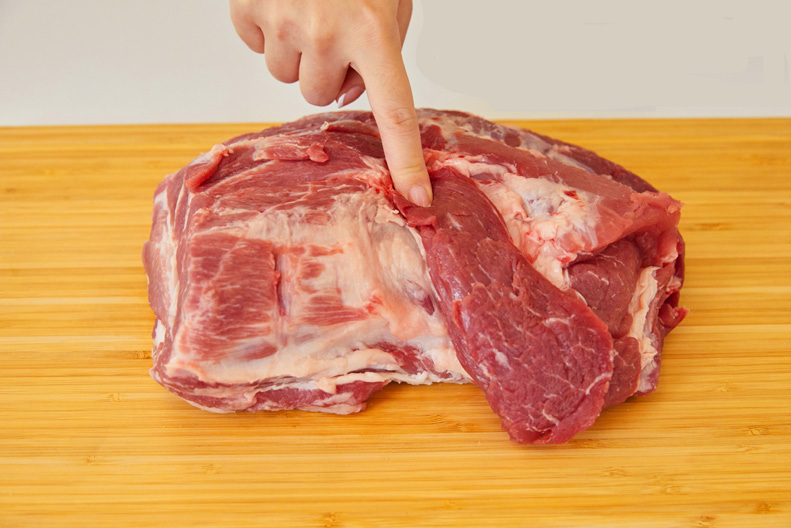 新鮮的肉用手按壓會有彈性,且不會沾黏刀具;若按壓會出水,表示豬隻可能是灌水豬;按壓後肉呈現塌陷的狀態,表示已經沒有那麼新鮮了。