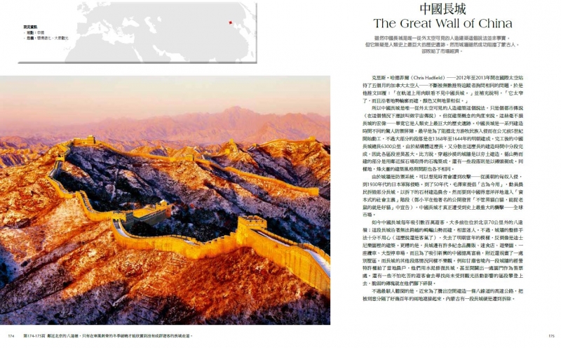 所以中國長城是唯一從外太空可見的人造建築這個說法,只是個都市傳說(在這個情況下應該叫做宇宙傳說)。但從建築概念的角度來說,這絲毫不損長城的宏偉─畢竟它是人類史上最巨大的歷史遺跡。中國長城是一系列建造時間不同的驚人防禦屏障,最早是為了阻擋北方游牧民族入侵而在公元前5世紀開始動工,不過大部分的段落是在1368年至1644年的明朝建成。完工後的中國長城總長6300公里,由於結構體這麼長,又分散在這麼長的建造時間中分段完成,因此各區段差異甚大。比方說,穿越沙漠的城牆是以夯土建造,循山勢而建的部分是用鄰近採石場取得的石塊築成,還有一些段落則是以磚頭砌成。同樣地,烽火臺的建築風格與間距也各不相同。