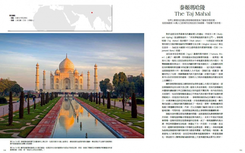 對於這座全世界最著名的獻給愛人的遺址,作家吉卜林(Rudyard Kipling)是這麼描述的:「所有夢境流經的象牙之門。」泰姬瑪哈陵(Taj Mahal)是沙賈汗(Shah Jahan)─16世紀至18世紀掌管印度次大陸多數地區的伊斯蘭蒙兀兒王朝(Moghul dynasty)第五位皇帝─為紀念38歲第14次生產時過世的愛妻阿姬蔓‧巴奴(Arjumand Banu)而建。