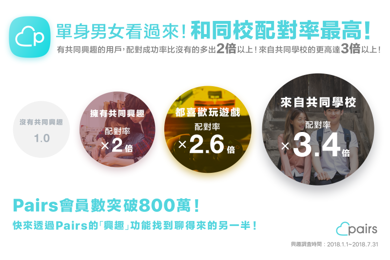 學校裡有社團,交友軟體裡也有「興趣社團」的功能(Pairs派愛族簡稱「興趣」),Pairs派愛族的調查發現,有共同興趣的單身男女,他們的配對機率是沒有的2倍!其中彼此喜歡「玩遊戲」的配對機率則是2.6倍,而來自同學校的配對機率更高達3.4倍!Pairs派愛族表示,單身用戶透過興趣功能,讓雙方聊天不怕尷尬,也容易產生共鳴,加深對彼此的好感度。而來自共同的學校,雙方不僅有共同的話題,更有情感上的連結,是配對成功率高的主因。
