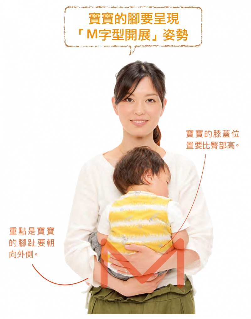 寶寶的雙腳一定要呈現「M字型開展」姿勢,記得確認膝蓋的位置是否比臀部高。「M字型開展」就是讓寶寶可以自然地放鬆又安心的姿勢。