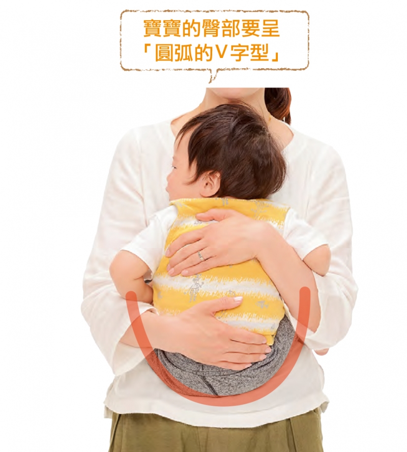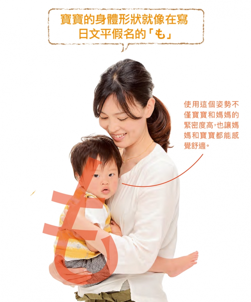 從側面看起來,寶寶從頭部到膝蓋的姿勢就像在寫日文平假名的「も」一樣。注意寶寶的脖子不要向後仰,而是要緊密地靠著媽媽的脖子到胸口這一帶。
