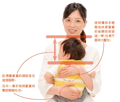 重點在於「要讓自己身體的軸心對準寶寶身體的軸心」。寶寶在3歲以前,上半身的身長大概等同於媽媽的鎖骨到肚臍這一段的長度,因此,若是讓寶寶的頭部的位置落在媽媽從脖子到胸口這一帶,寶寶的身體就可以確實地被支撐住。
