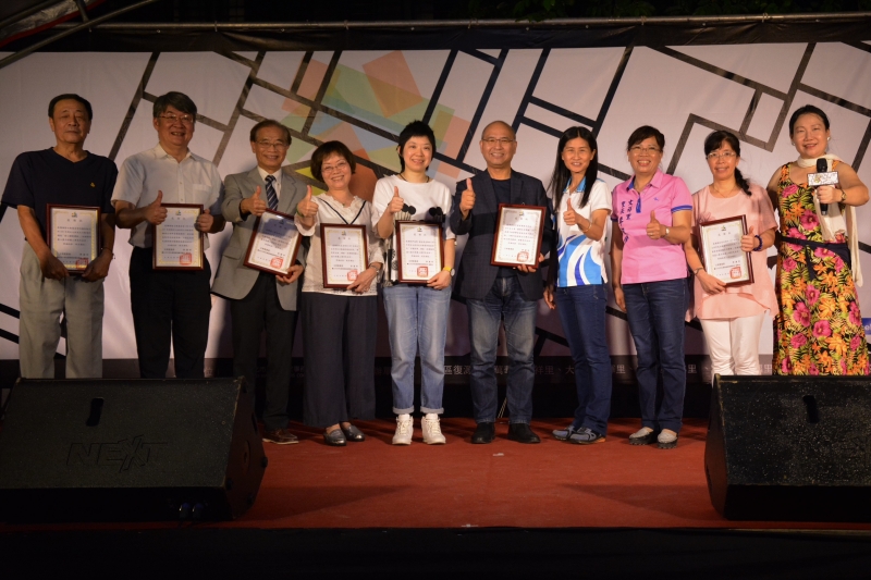 ▲ 中正區 廖雪如區長(右四)與文祥里里長李淑貞(右三)頒發感謝狀給臺北市政府客家事務委員會 曾年有主委(右五)及各個演出團體