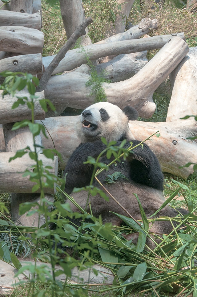 大熊貓館樓底高,大熊貓開開和心心過著自在的生活。