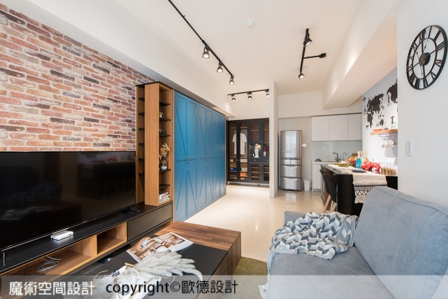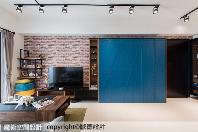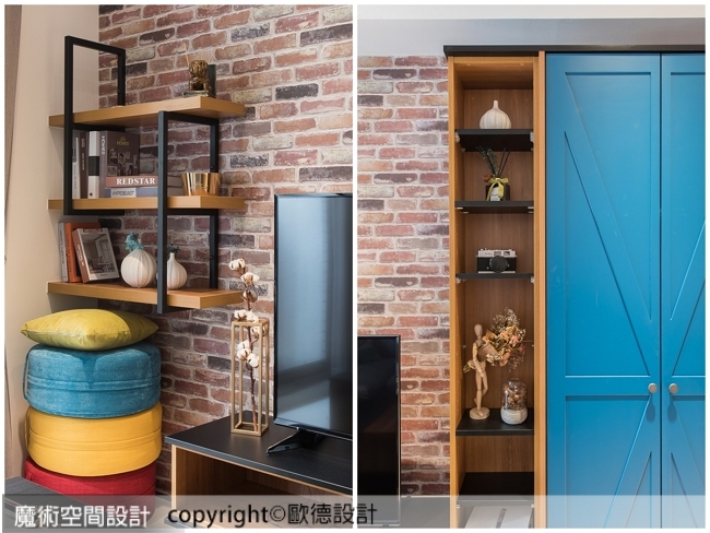 3. 紅磚牆壁紙打造亮麗特色電視牆面,電視櫃右側DVD柚木收納格上下各與寶藍色穀倉門、電視矮櫃有所連結,讓整體牆面具視覺整體感。左側以鐵件實木架作為展示或置物之用。