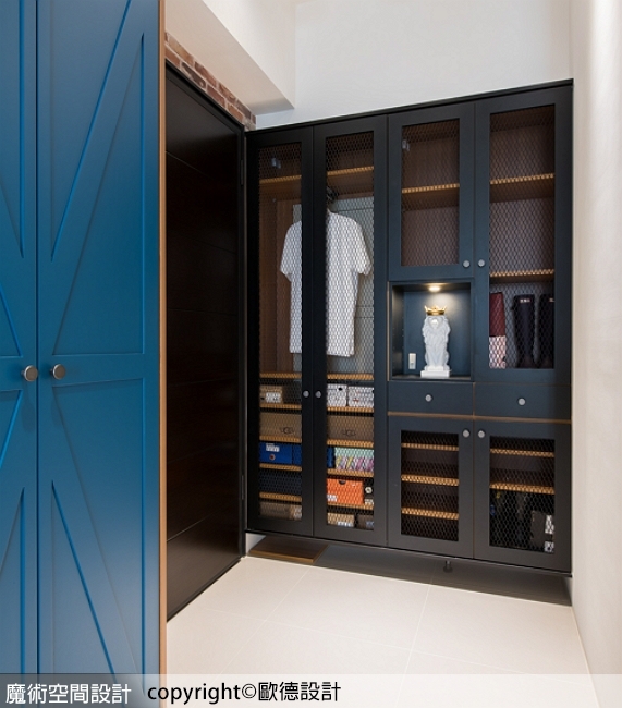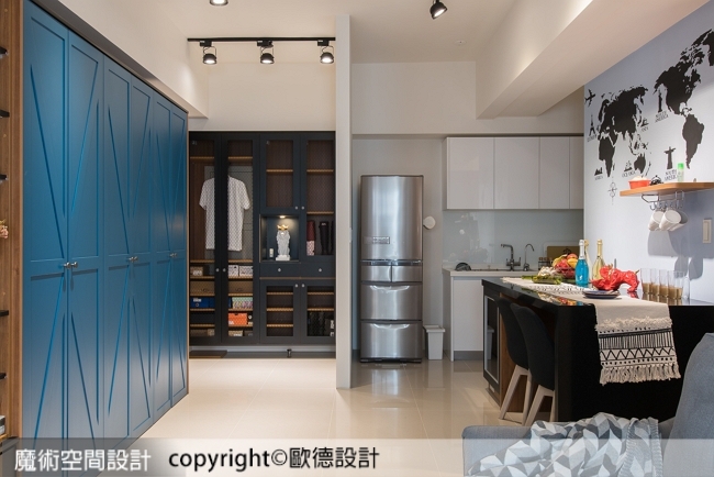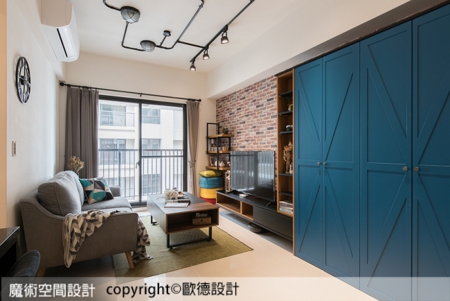 ▲寶藍色穀倉門是收納區,並作為大門與電視牆的連貫媒介,寶藍色穀倉門後大有玄機,沒有底板只有門片方便放置行李箱、除濕機、電風扇之類物品的收納。