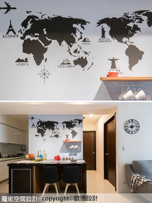 5. 中島餐廚區域最為搶眼的莫過於手繪世界地圖,藝術家在灰色牆面手工描繪世界地圖,簡潔的現代畫風十分吻合女屋主的經常出國出差的工作特性,和明快俐落的個性。