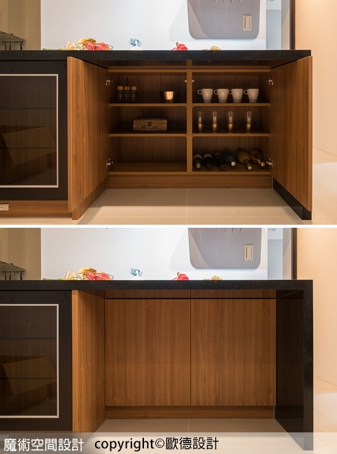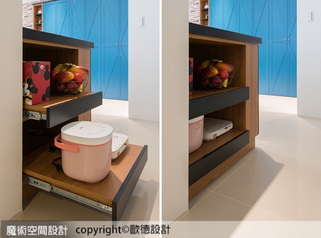▲侷限於小坪數和簡單的居住人口,設計師特別規劃功能強大的中島餐桌,兩側皆有收納功能,一邊是電器櫃,採滑軌式抽屜方便取用。