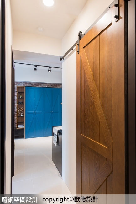 7. 衛浴間改造為柚木穀倉門設計,呼應電視牆寶藍色穀倉門,型塑公領域Loft風格的一致性。