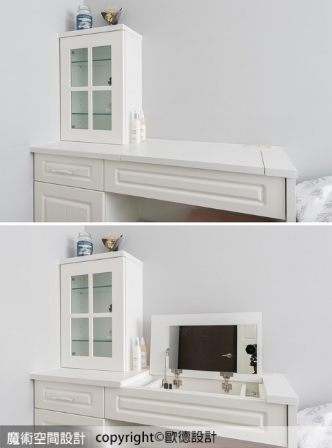 ▲運用柔美系統板材為女主人客製化可當書桌的多功能化妝桌,上掀式梳妝收納檯面巧思設計,大幅提昇實用機能。