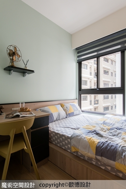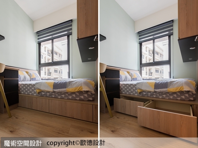 ▲次臥屬收納多功能的休憩空間,床下為兩個收納大抽屜,次臥可彈性運用,當成書房、客房、儲藏室…等使用,在有限的空間坪數內創造出無限的空間坪效。