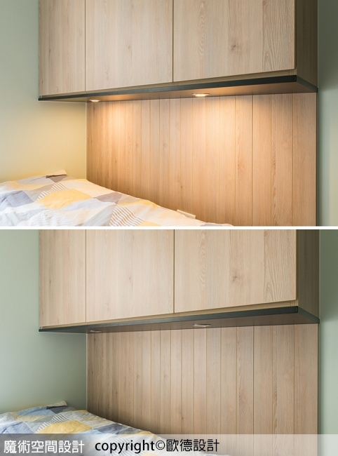 ▲次臥床尾懸掛式衣櫃下方內嵌2盞LED小夜燈,讓深夜起居更為便利。