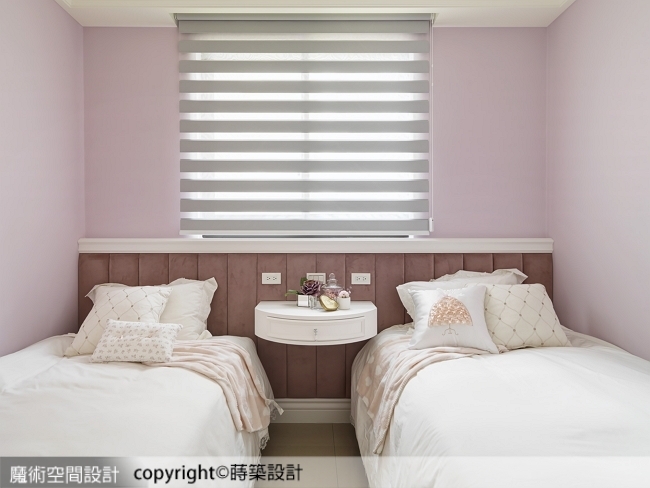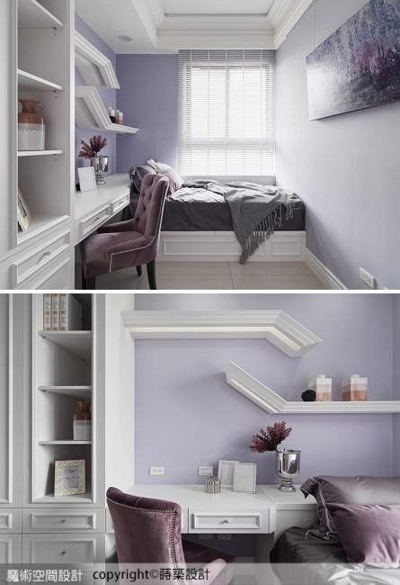 ▲女孩房以淡紫牆色與白色木作相互烘托,朱皇蒔設計師在壁面設計的埋燈造型層板,集照明、置物、美學於一身。