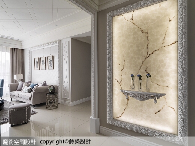 1.蒔築設計新規劃玄關區,運用浮雕框飾透光效果的視覺端景,隔牆後方則為實用效益高的儲藏室。