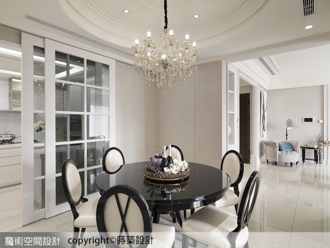 2.六位家人所需的用餐區,在尺度相對受限的場域裡,朱皇蒔設計師選用圓形餐桌搭配無扶手餐椅,保有新古典風格韻致,又降低桌角、扶手可能帶來的磕碰,維持四周動線流暢。