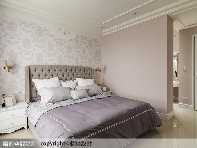 ▲主臥主牆以浮雕、壁燈等配件搭佐壁紙,新古典裝潢整體色調柔和宜人,牆側入口為更衣室及衛浴間。