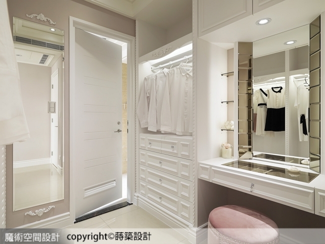 ▲更衣室包覆主浴空間,兩側布設精緻收納機能,長短吊桿、層架、抽屜齊備,還有亮麗的功能性梳妝桌。