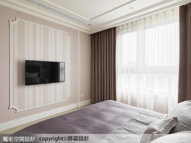 ▲床尾處以簡潔婉約背景壁掛電視,創造單純紓壓的臥眠環境。