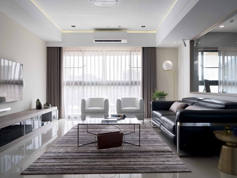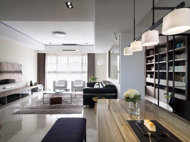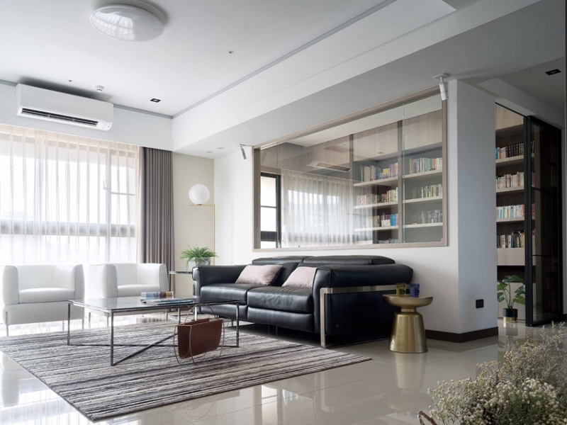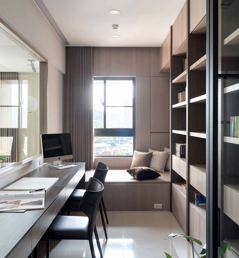 客廳裡特地簡化層次的天花板造型,於窗上兼具窗簾盒的實用性,讓優美的白紗線條可以向上延展,客廳內包括天花板、電視牆等處大致以柔白、溫馨淺摩卡色處理,以襯托皮革沙發黑與白的性格對話。書房內針對大量藏書特製整面書櫃牆,從靠窗的牆面修飾一路延伸至附帶收納的臥榻,統一採用質樸的鋼刷木料施作,適合獨處或冥想的溫度格外迷人。
