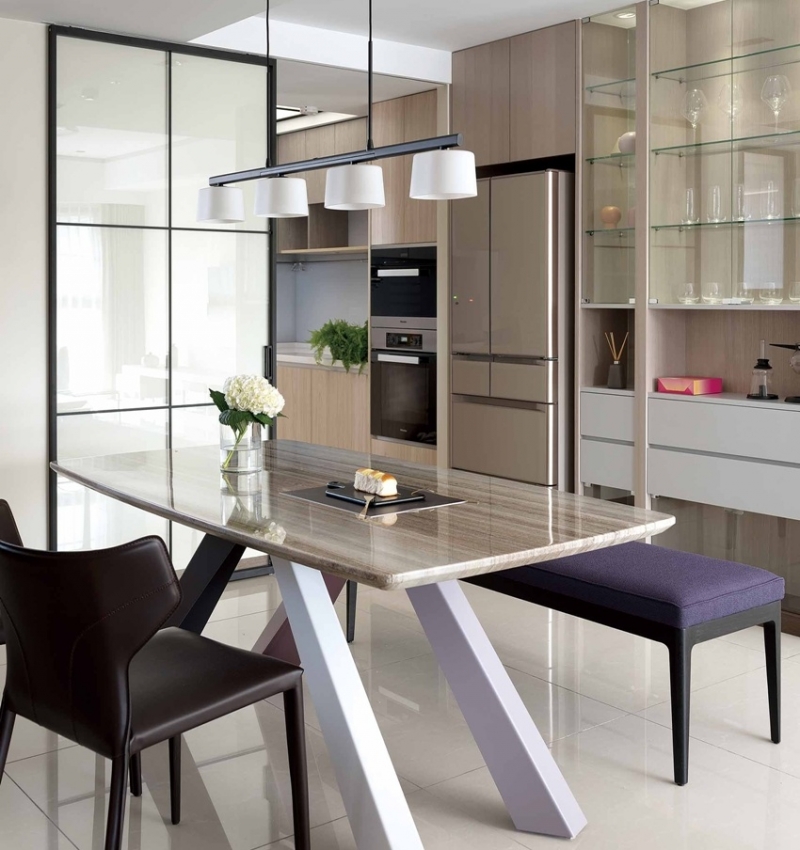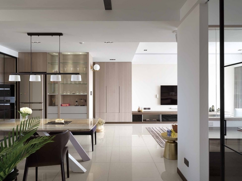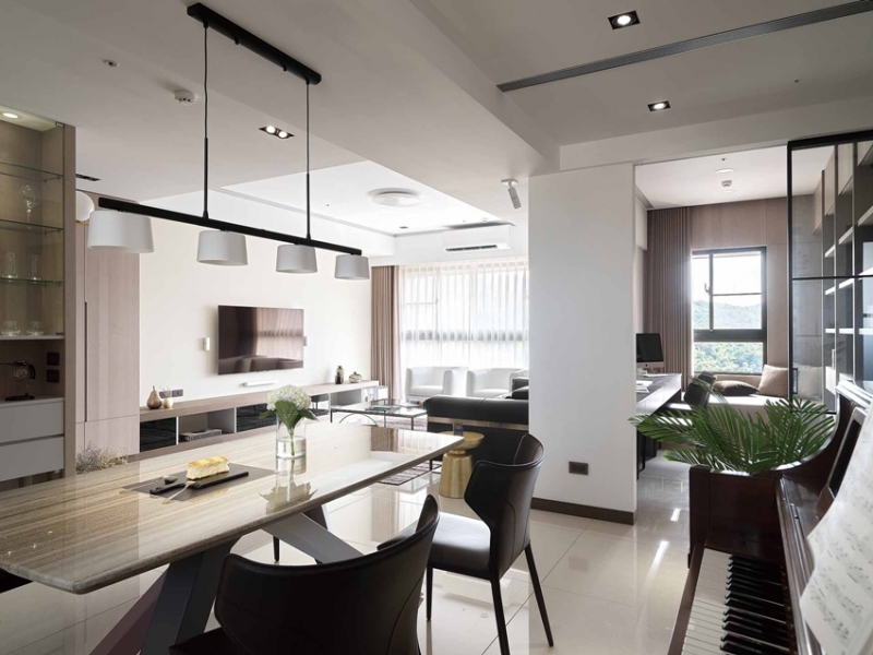 進門玄關區藉著由廚房向餐廳延伸的冰箱區、兩面櫃巧施界定,並配合地材差異明確區隔裡外。臨窗客廳寬敞明亮,窗外即是一整片校園的永久綠地,極遠處還有青山稜線層次起伏,令人格外心曠神怡!加大腹地的餐廳以餐吊燈、大理石餐桌搭配皮革單椅、長凳,點出情調悠閒的聚落核心,餐廳後靠另有鋼琴區機能,餐桌另一邊則與附設玻璃拉門分野的廚房比鄰,平時做菜時將門關上就能避免油煙外溢,但就算隔著拉門,依然能清楚看見廚房裡的各種動靜。