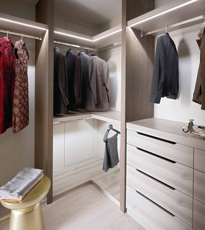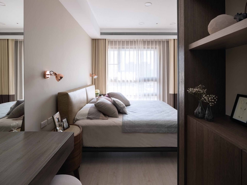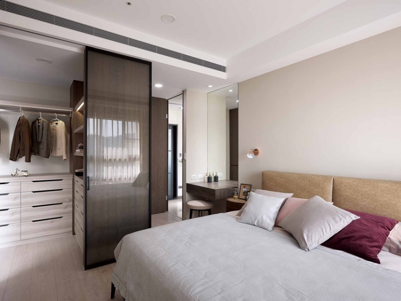 主臥室重新修改門向,因此多爭取到床畔梳妝區和實用展示櫃、外衣櫃等機能,室內以高雅藤色入鏡,與淺色木地板、雙色窗簾相輝映,床側並規劃專屬更衣室滿足收納需求,整體拿捏合度的人性化巧思,空間使用者最能心領神會。