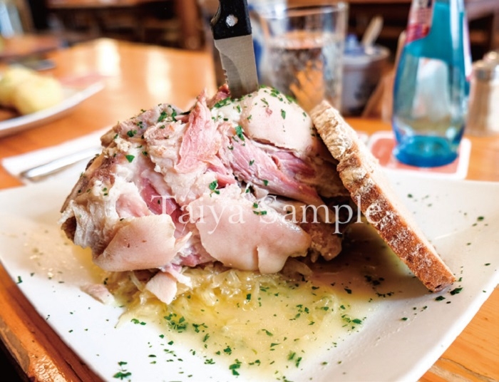 德國豬腳有分兩種:一種烤得像脆皮似的叫作Haxe,一般會先以鹽巴、大蒜、黑胡椒、葛縷子與黑啤酒先醃製,再去烘烤;若喜歡口感滑嫩一點的,可以點水煮的Eisbein。通常豬腳都佐以醃製酸菜與馬鈴薯泥,倘若不愛馬鈴薯泥者,也可以詢問店家,是否能換成炸薯條,也是滿不錯的組合。