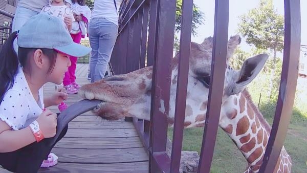 為什麼不去別處度假,偏選六福莊呢?!(本文不是業配)因為大小姐很小的時候,我買了一套「動物園道64號」的雙語卡通,經常放給孩子看,於是她對於卡通裡的長頸鹿喬吉娜非常有印象,也相當喜愛,再加上小主角露西每晚睡前,會從長頸鹿喬吉娜的脖子上,像溜滑梯一樣溜到動物園內,去找動物朋友聽故事。所以當我問升上大班的大小姐想去那裡度假時,她滿心期待的告訴我:「我想去看長頸鹿。」