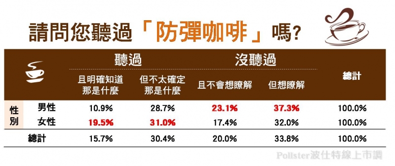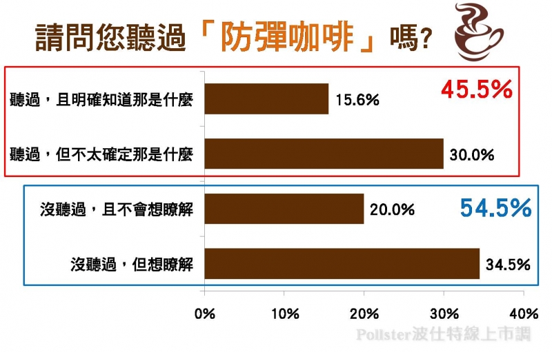 Pollster波仕特線上市調網詢問「請問您聽過『防彈咖啡』嗎?」。調查結果顯示,受訪者以「沒聽過,但想瞭解」的比例最高,占整體比例34.5%,其次依序為「聽過,但不確定那是什麼」(30.0%)、「沒聽過,且不會想瞭解」(20.0%)、「聽過,且明確知道那是什麼」(15.6%)。整體而言,「聽過」防彈咖啡的受訪者,占整體比例45.5%,而「沒聽過」的受訪者占整體比例54.5%,不過逾半數沒聽過的受訪者會想要瞭解防彈咖啡,可知此產品仍引發了部分民眾的注意與好奇。