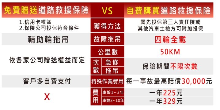 產險業者表示, 除只投保強制車險,就沒有這項加值服務 ,但有些保險如車體損失險是有附含免費道路救援服務,如電瓶沒電接電讓車子啟動、油箱沒水送水、汽車沒油送油(需自負油費)、車子爆胎更換備胎、車門故障或掉鑰匙需要車門開鎖等服務,及一般道路、省道、國道、山區及偏遠郊區的限里程基本拖吊 ,若只投保強制車險就沒有這項加值服務,但免費拖吊基本里程大多數為20~30公里以內,如果拖吊