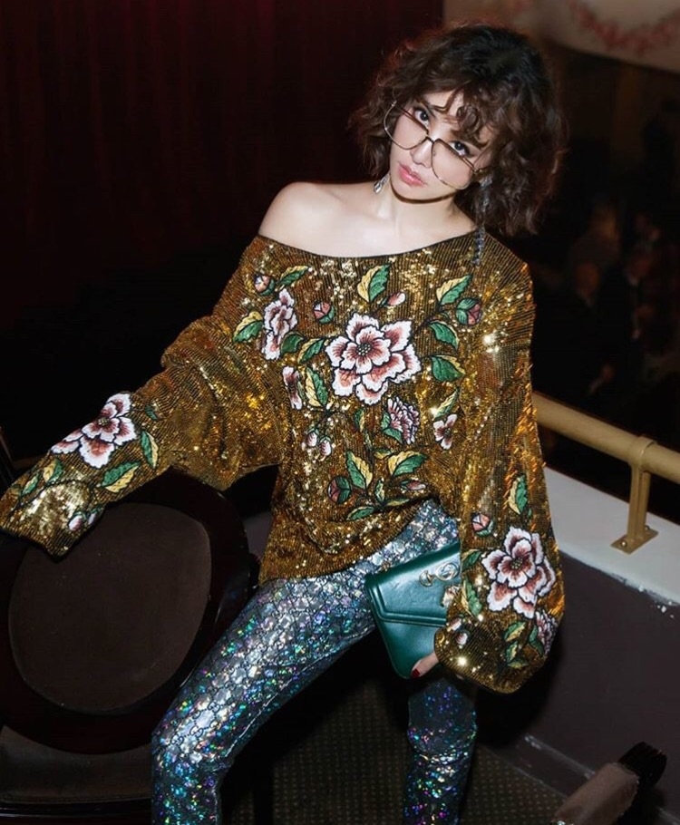 蔡依林一身 bling bling妝扮參加時裝周,戴著金屬框眼鏡,頂著泡麵捲的造型,展現嬉皮風格,透過鏡片看依舊是位美人兒阿~