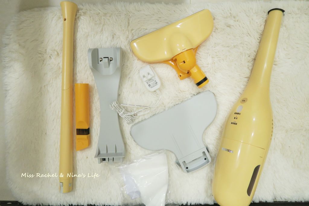 配件們一樣很簡單,有充電座、兩種吸頭以及主機一台,鵝黃的顏色真的好可愛唷,