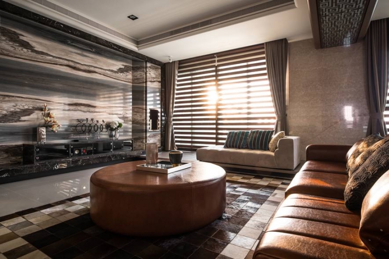 傍於淡水河岸的住宅,每當日落時分,殘陽自百葉窗扇闖入,照映在經典皮革家飾,為空間烙印上獨有的印記,溫暖而細緻。大片天然紋理石材牆面,與窗外風光交織,描摹出如詩如畫的待客處所。