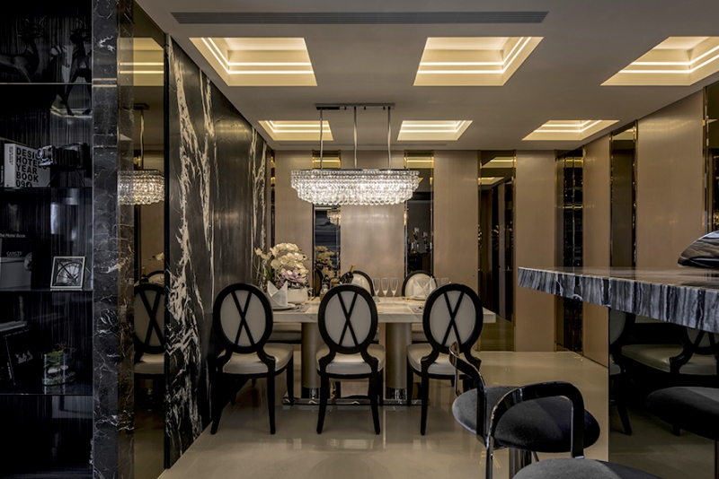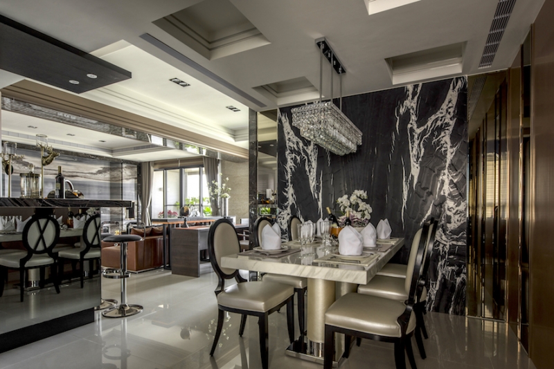 一旁與客廳毫無屏隔的餐廚場域,採開放式的空間配置,轉角處的迷你時尚吧台,完美銜接廚房與餐廳的相異調性;做為共享佳餚的場所,鏡面與木色相互交會的牆面,巧妙延伸出舒心視覺效果;餐桌上方選以華麗水晶燈飾,搭配素雅白色餐桌椅,內斂中散發奢華光芒。