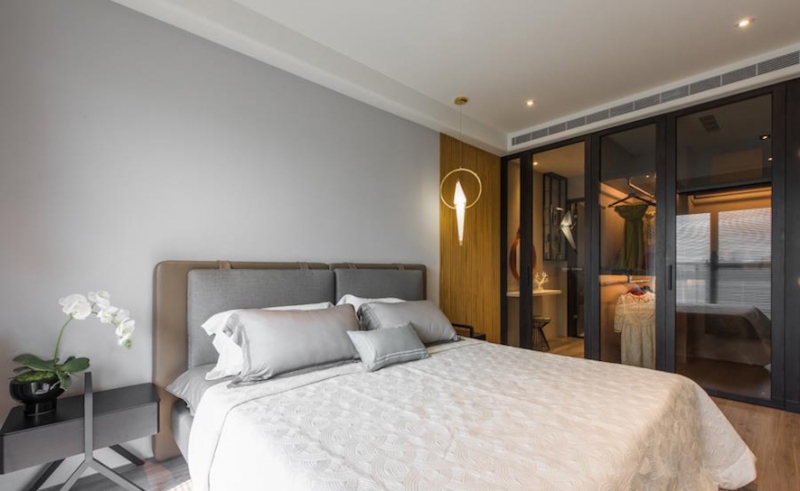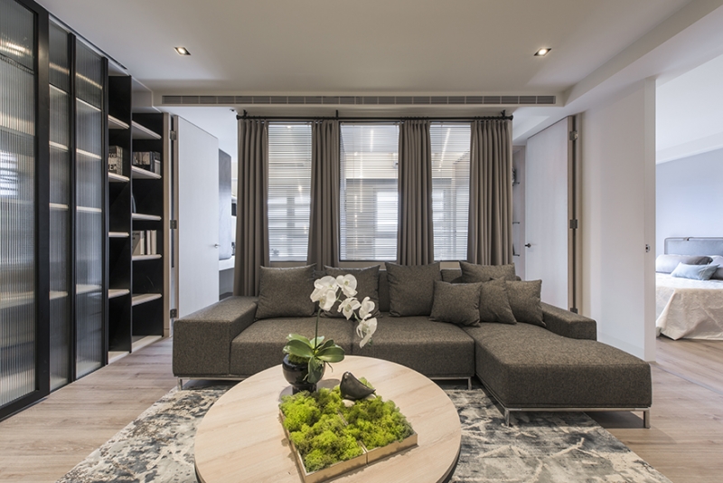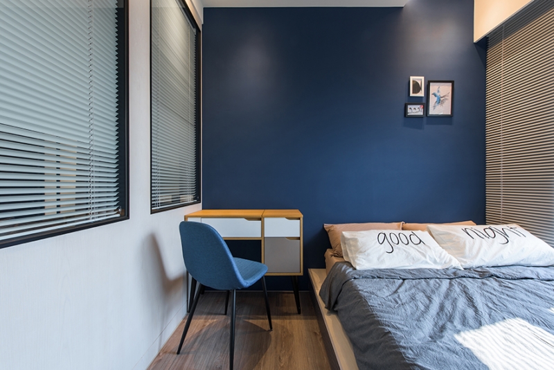 臥室中的百葉窗設置不僅能打造視覺穿透性,同時也能引入窗外風光,每日以晨曦喚醒沉睡的人,形塑清新自然家居。在井然有序的簡約設計下,蘊含居家住宅所需的收納機能;經由透明拉門一窺衣帽間樣貌,在柔和的燈光襯托木質壁貼,宛如時尚精品的櫥窗展示。