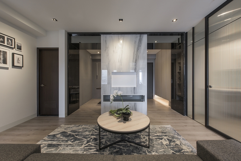 開闊的空間格局,能讓有限坪數,創造出無限可能;此獲獎作品在隔間上捨去厚重水泥牆,取而代之的是半透明門板及百葉窗,若有似無的視感使居住者擁有輕盈感受;在客廳與餐廳的間隔部分,則採用與地墊相呼應的石牆,作為豎立於兩者之間的狹長屏障,使看似相通的場域,依然保有一絲隱蔽性。