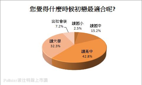 調查結果顯示42.8%的民眾認為「讀高中」的時候最適合,其次32.3%的民眾則是認為「讀大學」時比較適合,覺得應該要更早一點,「讀國中」就該有初戀則是排名第三,占15.2%的比例,而認為應該等到「出社會後」或是「讀國小」就有初戀者則分別僅占一成以下的比例,占7.2%和2.5%的數據。由此可以了解約八成以上的民眾認為初戀最好的時機還是在讀高中後,國小和國中就戀愛相對來說還是太年輕了。