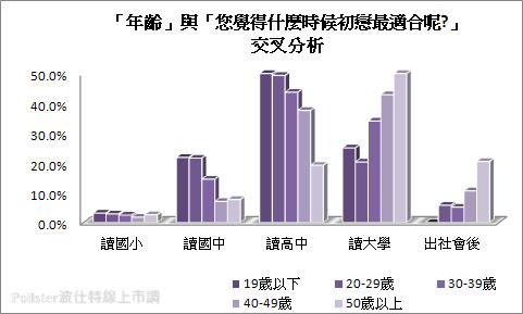 從不同年齡進行分析可以大致歸結出年紀愈大者相對認為初戀年齡應該延後,適合期間為「讀大學」及「出社會後」,反之愈年輕者則認為應該要愈早談戀愛,尤其覺得「讀高中」就應該有初戀,19歲以下年輕人所占的比例就相對遠高於50歲以上年長者,可以了解年齡不同對於初戀的年齡也反映出不同的看法。