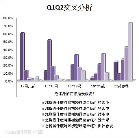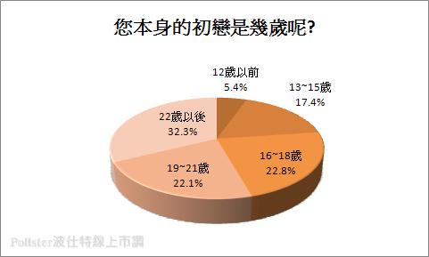 結果顯示將近三分之一的受訪者初戀是發生在「22歲以後」,基本上為即將大學畢業後、甫出社會時的年齡,實占32.3%,22.8%和22.1%的民眾其初戀時間發生在「16~18歲」讀高中時和「19~21歲」就讀大學期間,17.4%的民眾是讀國中,「13~15歲」即有初戀,而5.4%的民眾初戀發生則是在讀國小時「12歲以前」。