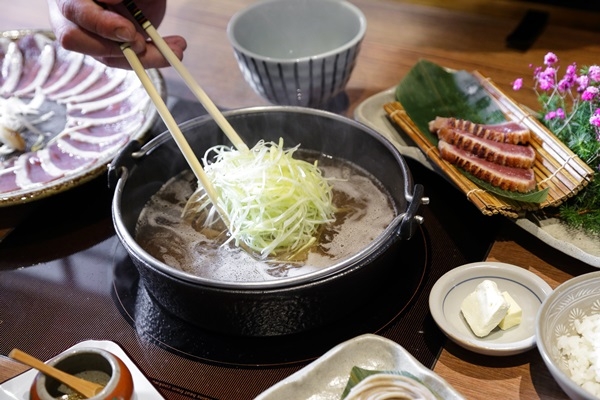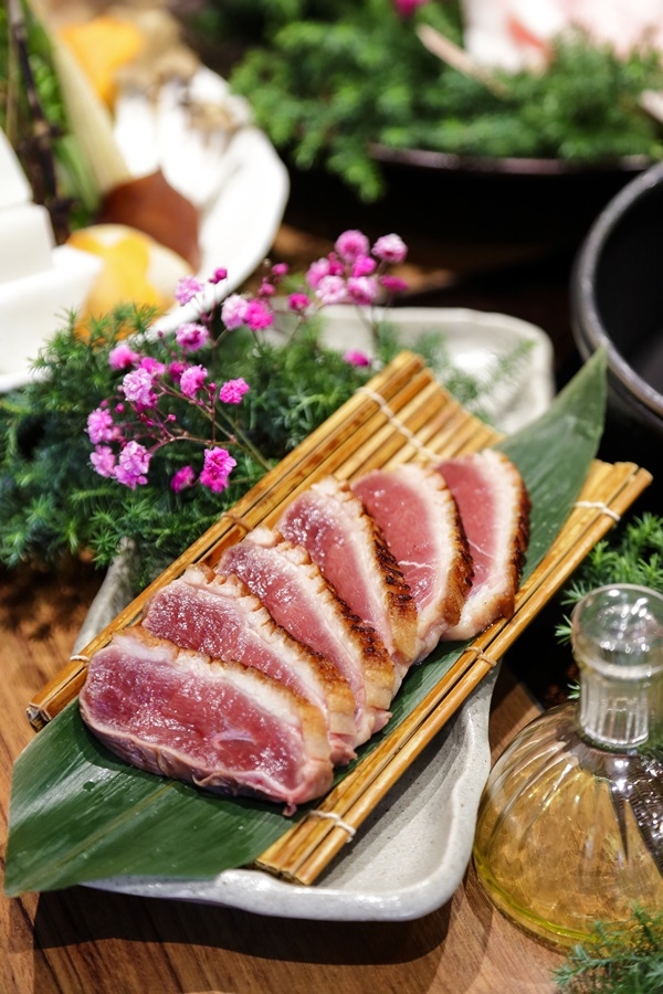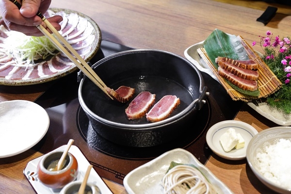 於逐漸轉涼的秋天之際,正是最適合吃鴨肉的季節,此時肉質正值壯嫩肥美、富含營養。「黑毛屋」推出源自日本滋賀縣的鄉土料理「松露櫻桃鴨鍋」,一鴨二吃,先嚐厚切的宜蘭產櫻桃鴨胸,自製蔥油香煎微酥融合豐富油脂與細緻肉質,搭配山椒鹽、松露鹽、柚子胡椒三種調味,入口滿溢曼妙滋味。台灣產日本大蔥口感甘甜有水分,融入由厚切柴魚和牛肝菌熬煮成的湯頭更能提味,將鴨肉於鍋中輕涮3秒夾入蔥絲一起搭配享用,又是另一種銷魂滋味。