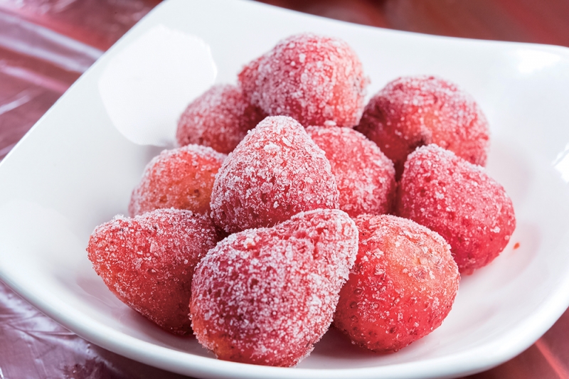 除了這些體驗活動外,官老爺休閒農場的另一大重點就是田媽媽田園美食坊,而美食坊的部分則由金霞大姊掌廚。她的瓜瓜風味餐不僅極富創意,將哈密瓜、南瓜⋯⋯等以低油、低鹽、低糖的方式來烹調出高纖維超美味料理,其中有哈密瓜雞湯、南瓜米粉、哈密瓜炒杏鮑菇、酥炸南瓜⋯⋯等等,道道都是招牌,更特別的還有季節限量版的「冬天裡的太陽:冷太陽」。什麼是「冷太陽」?原來官老爺將完整的新鮮草莓整個經過醃製後,急速冷藏而成,口感獨特,酸甜可口,只有在草莓產期限量製作,錯過時,想吃還吃不到喔!