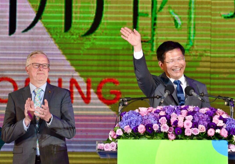 圖說:林佳龍(右)在國際園藝生產者協會主席歐斯特羅姆(左)的見證下,宣布花博正式開園。翻攝自林佳龍臉書