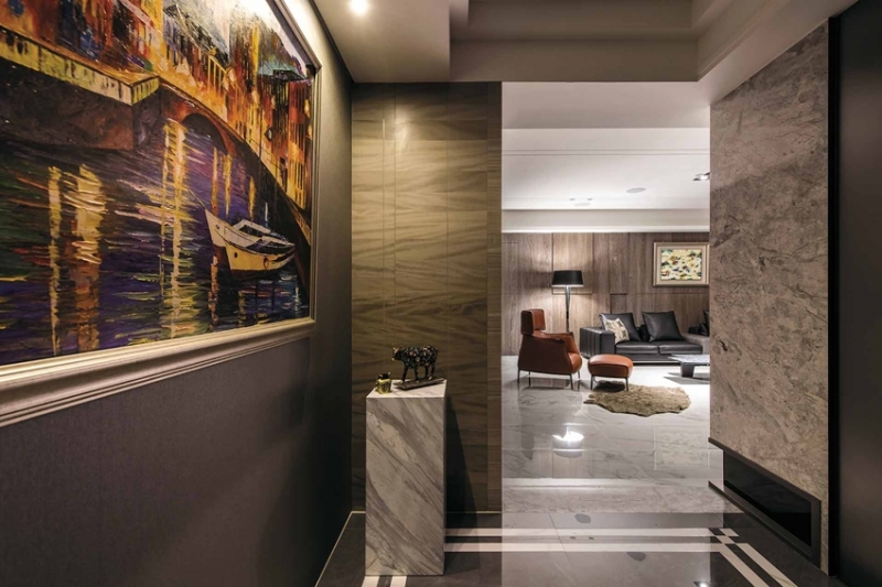 一走進玄關區,即能深刻領受全案強調「質地、美感與實用兼備」的基本訴求,順應原有結構柱而略顯壓縮的開口,令望向客廳的視線格外深邃,此區地面以耐刮磨的雙色地磚,模擬精湛的大理石拼花效果,左側聚焦燈光下;大幅壁掛寫景畫作為主人心愛收藏之一,也是最點題的迎賓焦點。玄關另一側安排低調的儲藏室暨衣帽間入口,有效取代佔空間的實體櫃列,從客廳電視牆轉折延伸而來的石材質地,與下緣略內退的木作層次,彷彿為下一幕的驚豔暗埋伏筆。
