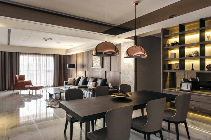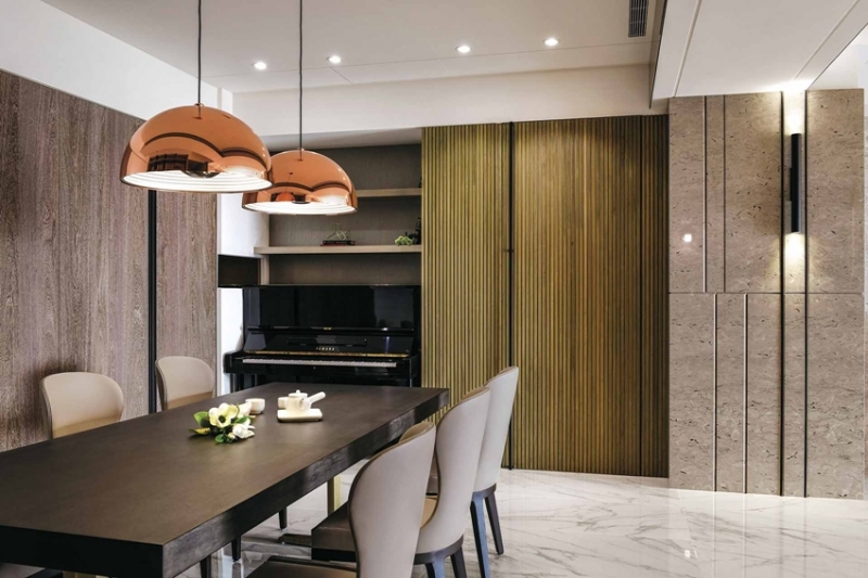 客、餐廳共享的公領域佈局,首先訂出關鍵的縱向、橫向軸線,精算比例後再透過對稱語彙,搭配家具、立面造型、材質變化等元素,經由靈活排列組合以營造現場的大器尺度,特別是電視牆往餐廳延伸的銜接面處理,原先的巨大結構柱,當設計師融入導角拼接的大理石工藝與精美壁燈後,搖身一變成為精緻亮點,此外,視線連貫的合理、趣味同樣重要,在客廳、餐廳、鋼琴區之間,各有不同的端景、造型面、間接光,體現不同區域的機能、情境主題,擺設得宜的家具、單椅、燈飾、藝術品,彷彿是空間中負責起承轉合的標點符號,牽動著與眾不同的生活品味。