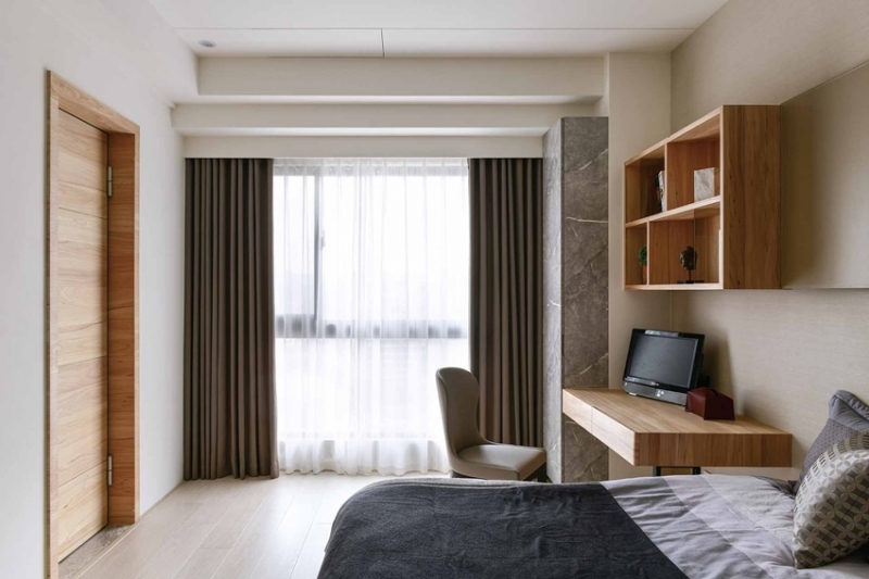 私領域包含三間主次臥室,均採高規格套房配置,設計上絕對可視為生活美學的具體實踐。首先,充裕起居空間、體貼入微的機能設計、以及橫向三進式的分區動線,都是主臥室設計重點,床尾灰綠色的視聽牆低調質樸,右側近窗另備有小巧閱讀區,床側隔間處以仿石紋板材打底,一併整合進入更衣室、專屬浴室的動線入口,上方、側面貼飾茶鏡,藉材質反射帶出場域轉換時的虛實趣味。截去部分空間以放大餐廳的次臥室之一同樣精緻過人,進門處規劃閱讀區,並以一段玻璃屏風和睡眠區分野,床尾一整列衣物櫃與浴室入口同步整合,加上燈光、寢飾、相關軟硬體一氣呵成,展現更勝時尚旅店的品味高度。