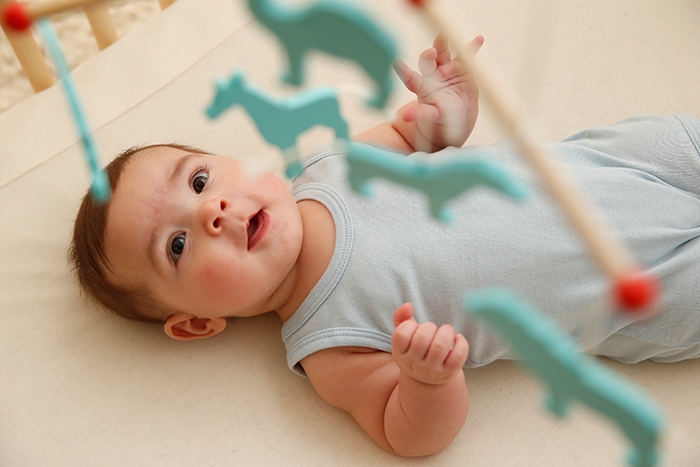 這個年紀的孩子已經會開始察覺聲音從哪裡來,他們會很專注的聽,也會將目光朝向聲音的來源。孩子會開始發出ㄅ、ㄆ、ㄇ的音,笑也會發出聲音。相對於之前新生兒,4-6個月的孩子,已經可以用聲音來表達自己的情緒。如: 興奮、生氣、開心等等。