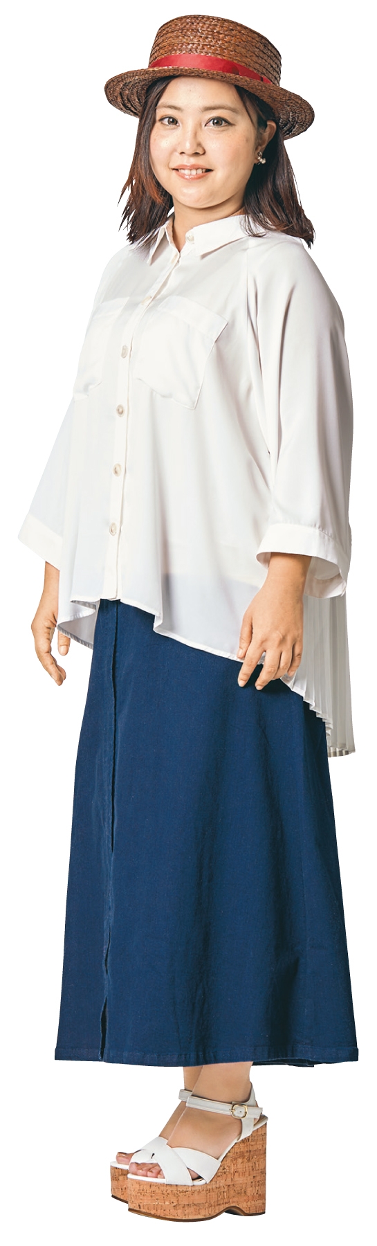 下半身屬於寬廣型的人,穿衣服時要盡可能讓重心上移。藉由戴帽子將視線往上集中,最在意的腿部就用深色長裙來修飾。但切記還是要露出一些腳踝,才不會感覺太過沉重。選擇與康康帽材質十分相似的楔型涼鞋,風格一致的造型就輕鬆完成了。