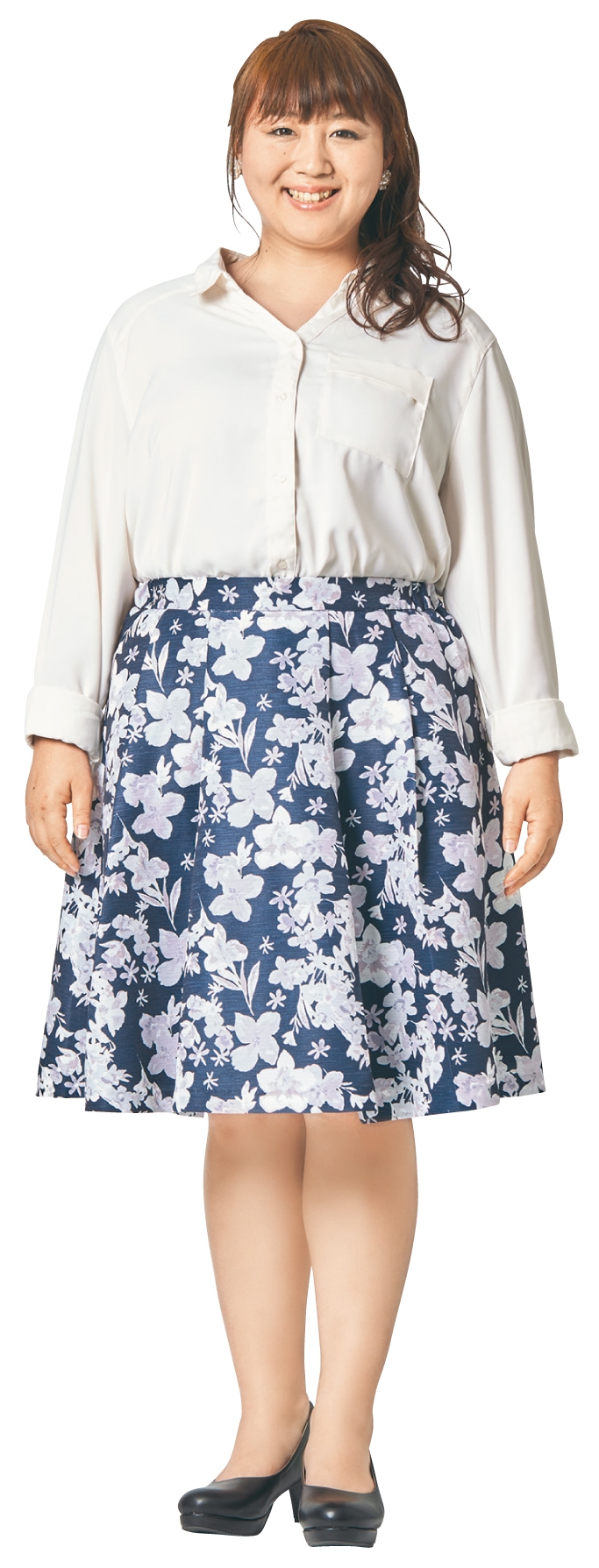 只要將襯衫塞進圓裙裡,從兩側肩膀到裙襬的左右兩端,會形成一個顯瘦的「X」線條。這個穿搭技巧可以讓身材曲線變得凹凸有致,對於圓筒體型更能立即見效!為了避免給人太呆板單調的印象,建議搭配有圖案的裙款,才能穿出立體感。