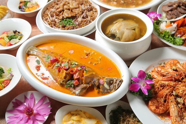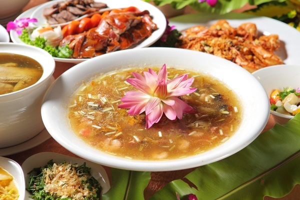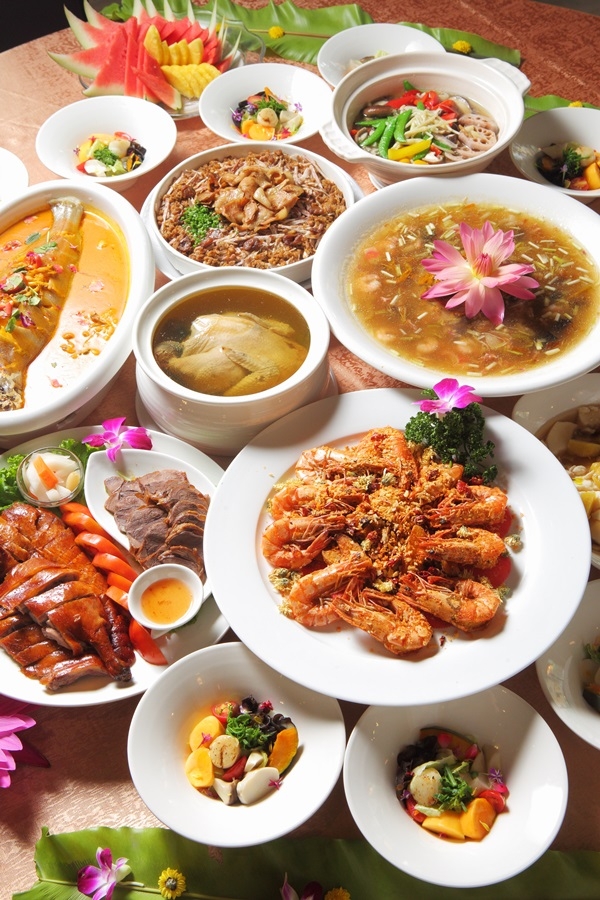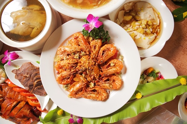 主廚更以多種創意手法穿插各種菜系,花現黃金帝王鱈利用南洋香料鋪陳視覺焦點,鮮豔的薑黃調和咖哩風味,點綴些許食用花和小番茄,為鱈魚的鮮美度錦上添花;類似避風塘作法的杭菊花焙海熊蝦,則是選用海水養殖的熊蝦在菊花微微的提香之下,味道鮮美而芬芳;霸王花土雞盅湯如其名,「味」壓全場,採取道地的港式煲湯,霸王花就是曇花,搭配蜜棗、南杏等食補藥材,湯頭清香又養身。