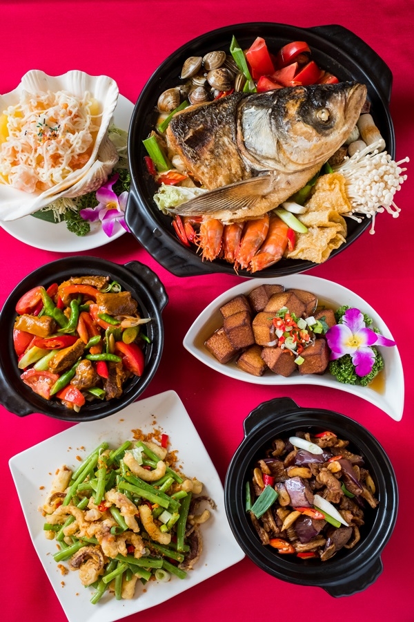 宴會廳中點菜率超高的干鍋牛腩和蒜香軟絲都是主廚的拿手菜,加了辣椒提味增色的干鍋牛腩吃起來不辣,不僅下飯,大小朋友都適合食用,炸過的軟絲和乾蒜片拌炒,吃起來有鹽酥雞的感覺,每口吃起來酥脆有嚼勁,即使冷掉了也相當可口,是配飯或閒聊下酒的良伴。此外,老皮嫩肉為雞蛋豆腐油炸過,讓外表顏色變焦黃,咬下卻有軟嫩無比的口感,以及中式懷舊辦桌喜宴菜果律蝦球,都是老少咸宜的台菜,即日起水都開賣雙人料理加贈露天風呂、中式桌菜等CP值超高的優惠券,喜愛泡湯嘗美食的朋友不可錯過。